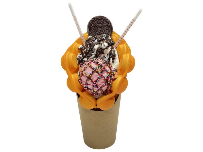 Διακοσμητικό Bubble Waffle. 1 μπάλα παγωτό ροζ/φράουλα, μπισκότο oreo, παγωτό soft, σιρόπι σοκολάτας, sticks βανίλιας.