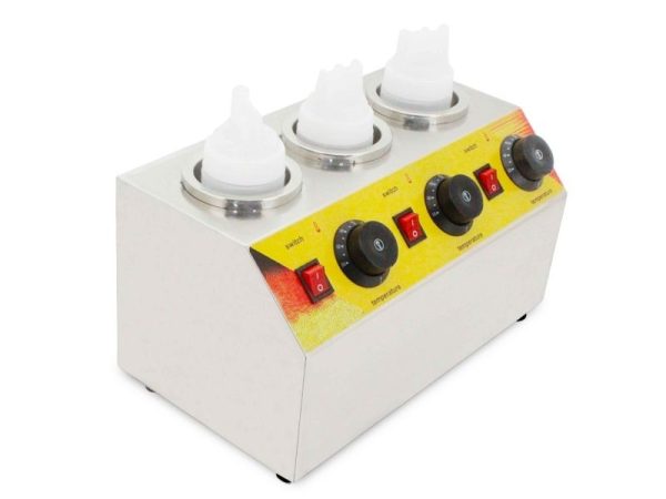 Θερμαντικό πραλίνας, σιρόπι σοκολάτας και κάθε άλλο σιρόπι ή γλυκιά σάλτσα. Περιλαμβάνονται τα ειδικά πλαστικά δοχεία squeezer με τα τρία στόμια