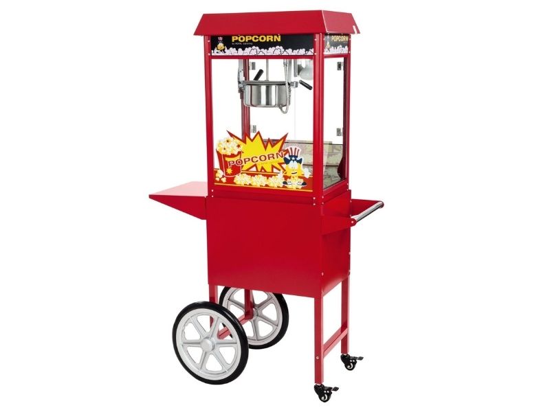 Επαγγελματική ποπκορνιέρα. Σετ που περιλαμβάνει τη μηχανή CE140-114 μαζί με trolley. Το trolley διαθέτει ράφι, λαβή, ενσωματωμένο θάλαμο για την αποθήκευση αναλώσιμων και επίσης 2 μεγάλες ρόδες και 2 μικρές με φρένα.